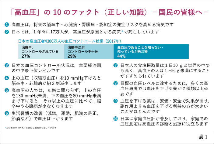 今日のテーマ「心臓と腎臓を守る暮らし方」主に高血圧のお話をします。今年改訂されました「高血圧管理治療ガイドライン」では血圧が120oHg/80oHgを超えるような方は、まず生活習慣を見直すと書いています。そして今日皆さんにお伝えしたいことが「高血圧」の10のファクト、高血圧学会でまとめた10の正しい知識です(表1)。