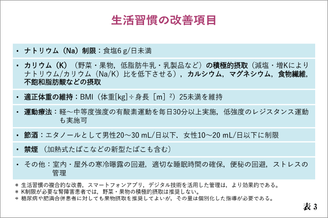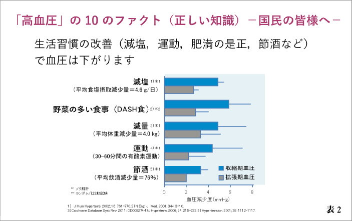 六番目が「生活習慣の改善で血圧は下がります」(表2、表3)減塩ですね、1日摂取量を5g未満にすると、上の血圧が5oHgぐらい下がる。野菜の多い食事を摂ると6oHgぐらい下がる。体重を減らすと5oHgぐらい下がる。運動も4oHgぐらい下がる。お酒を控えるだけでも3oHgぐらい下がるとかですね。生活習慣の改善を組み合わせる、減塩、塩分を減らして、野菜を増やして、体重を減らすと、組み合わせることでさらに下がるので、まず血圧が高いと指摘されたら、すぐに生活習慣の改善に取り組んでください。